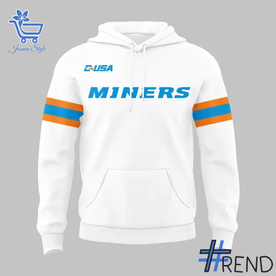 Inspired by the look of the team’s striking uniform and helmet, this hoodie features a crisp white body that makes the iconic UTEP colors—orange and blue—truly pop. The sleeves are accented with sporty double stripes in orange and light blue, mirroring the helmet’s dynamic striping. The front proudly displays “C-USA MINERS” in bold light blue lettering, letting everyone know which team you back.