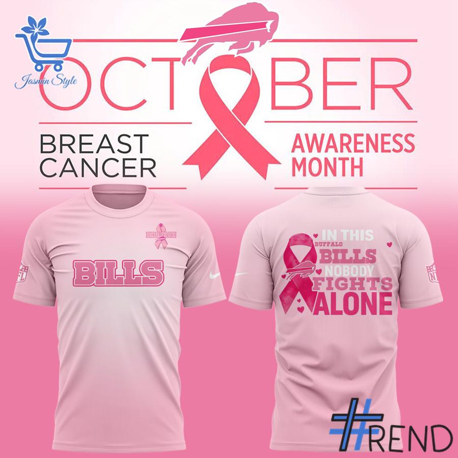 The true heart of the shirt, however, lies in the back design. A large, intricate graphic showcases a bold pink awareness ribbon wrapped around a detailed heart motif, set above the deeply resonant message: “IN THIS BUFFALO BILLS NOBODY FIGHTS ALONE.” This inspiring slogan, coupled with the team’s strong imagery, creates an emotional connection, transforming this item from simple Bills apparel into a symbol of community and hope. The inclusion of the Buffalo Bills logo as part of the overall campaign branding ties the entire message together seamlessly.