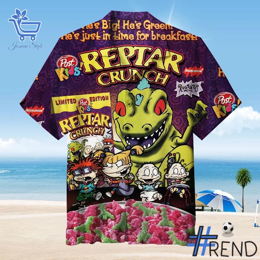 The Hawaiian shirt is a lively celebration, featuring a dynamic design inspired by the iconic “Reptar Crunch” cereal advertisement. Dominated by vibrant purples and greens, the shirt showcases a playful Reptar character, surrounded by the lovable Rugrats gang. The bright, bold imagery of the colorful cereal at the bottom adds a splash of whimsy and fun, making this shirt a standout piece that’s sure to turn heads.