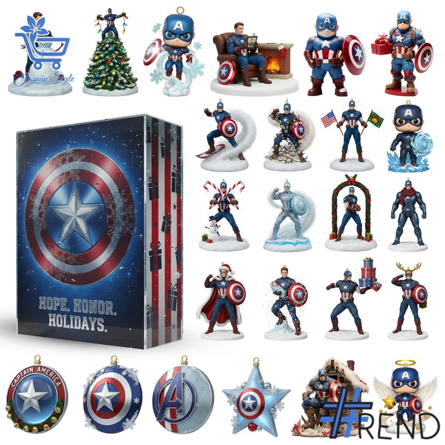 Inside this striking, sturdy box—emblazoned with the powerful message “HOPE. HONOR. HOLIDAYS.” and a dazzling, snowflake-studded Captain America shield—you’ll discover 24 mica acrylic one-sided ornaments. The calendar’s design is an absolute standout: deep navy blue, bright red, and brilliant white star motifs capture the essence of Cap’s iconic uniform.