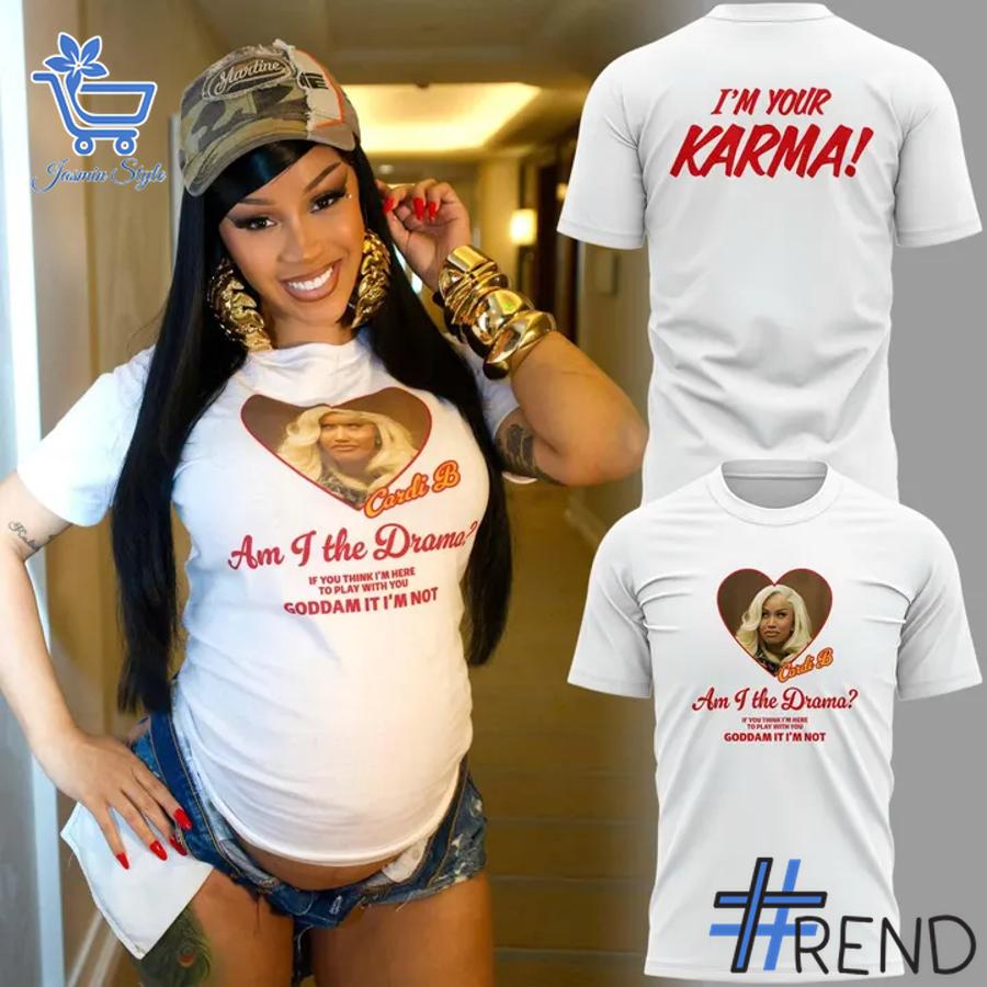 Sliced from premium, buttery-soft cotton that’s lightweight and breathable for all-day slay sessions, the Cardi B New Album Am I the Drama Shirt boasts a relaxed unisex fit with reinforced seams to handle your wildest twerk-outs. The front steals the show with dual heart-shaped portraits of Cardi—one fierce and unfiltered, the other mid-snarl—framed by swirling red script declaring “Am I the Drama?” Below, the cheeky manifesto hits hard: “If you think I’m here to play with you, goddamn it I’m not,” a direct nod to the album’s themes of reclaiming power amid the mess. Flip it for the back’s punchy red proclamation, “I’m Your Karma!”—pure poetic justice that echoes her lyrical roasts on Offset and beyond. Subtle gold accents and high-quality screen prints ensure vibrant, fade-resistant colors wash after wash.