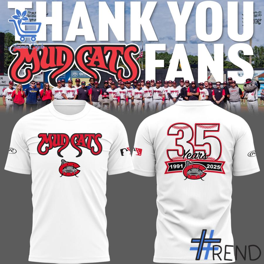 Picture this: A striking white tee front boldly displays the swirling, psychedelic “Mudcats” script in fiery red, evoking ’70s rock poster energy, crowned by a mischievous gray catfish logo with whiskers curling like a sly grin. Flip it around to reveal “35 Years” arched in bold red stitching over a baseball-seam banner spanning 1991-2025, flanked by vintage Mudcats emblems that nod to the team’s storied past. The red variant amps up the intensity with a crimson base that pops against white accents, while hoodies mirror the design in hoodie-friendly cuts, complete with Rawlings and MLB patches for that authentic touch. Subtle textures – from the embroidered edges to the soft fleece lining – create a tactile appeal that’s as immersive as stepping onto the field.