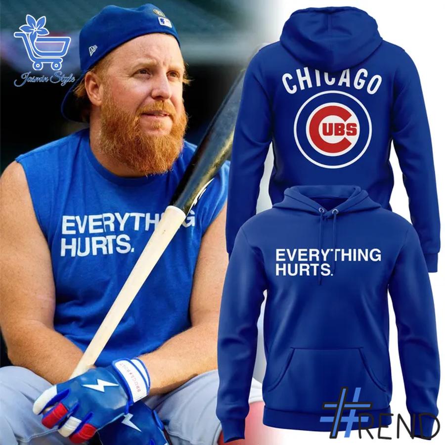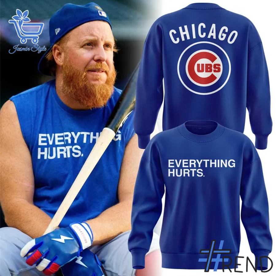 The standout “Everything Hurts” slogan is displayed in crisp white typography on the front of a classic Cubs blue T-shirt, instantly recognizable to fellow fans. It’s a nod to the gritty, never-say-die attitude of the team and its supporters, making it a truly unique piece of Wrigleyville apparel. The back of the shirt proudly features the iconic circular Chicago Cubs logo and the word “CHICAGO” in a bold print, ensuring your loyalty is known from every angle.