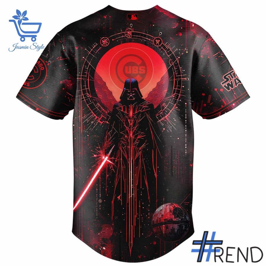 The back takes the design to the next level, featuring a dramatic full-body Darth Vader graphic wielding his glowing red lightsaber, framed by intricate circular patterns and a bold red Chicago Cubs logo in the background. This fusion of sci-fi artistry and sports heritage creates a powerful visual impact that fans will admire from every angle.