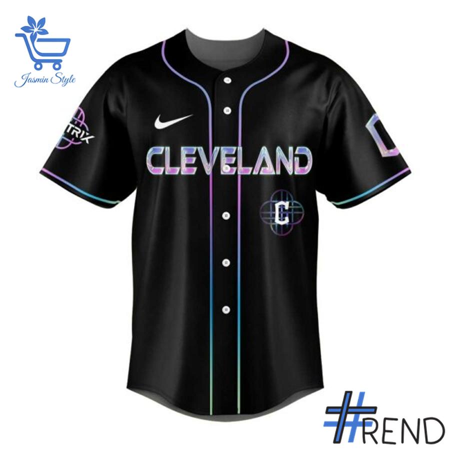 The design is nothing short of electric. On the front, the sleek black fabric is elevated with holographic-style lettering spelling out Cleveland, complemented by neon-inspired piping that runs along the buttons and collar. The Guardians’ emblem sits proudly on the chest, tying in authentic team pride. The back brings the jersey to life with vibrant illustrations of the KPop Demon Hunters characters—dynamic, confident, and ready for action. Their colorful, futuristic outfits pop against the dark background, with names and logos adding an extra layer of detail. Every angle of this jersey feels like a statement piece straight out of a music video or animated battle scene.