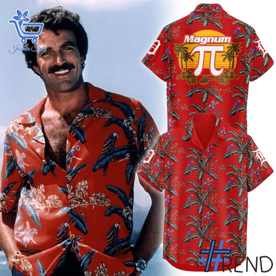 This Magnum PI Day shirt features a vibrant, eye-catching design inspired by the classic “Jungle Bird” shirt worn by Tom Selleck’s character. The bright red fabric is adorned with a tropical pattern of palm fronds and parrots, creating an unmistakable look. What sets this MLB apparel apart is the clever integration of Tigers branding, seamlessly blending the iconic Detroit Tigers logo and “Magnum Pi” text into the design. It’s a fun and festive twist on classic fan merchandise, making it a powerful conversation starter and a true collector’s item.
