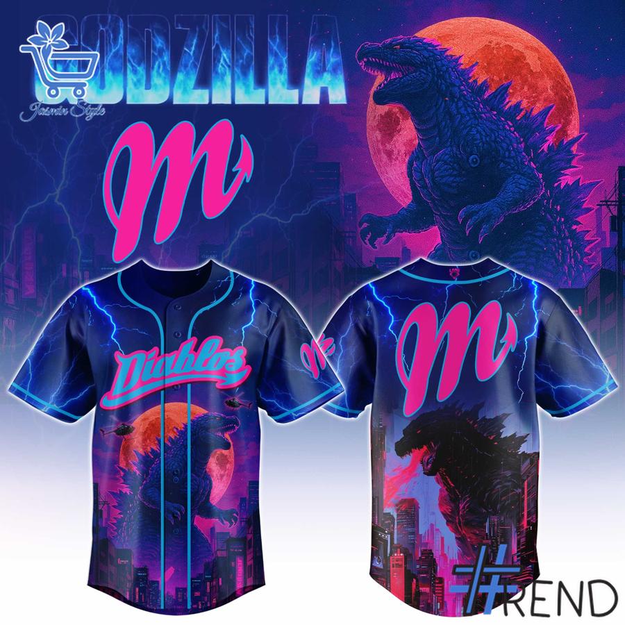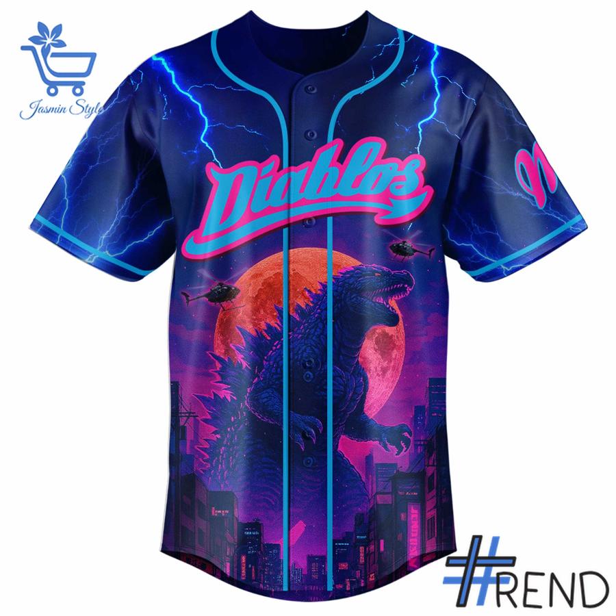 The jersey features a mesmerizing blend of electric blue and vibrant pink hues that leap off a backdrop of deep, cosmic purple. At the heart of the design, Godzilla himself emerges, silhouetted against a blood-red moon, ready to rampage through a neon-lit cityscape. This isn’t just team apparel; it’s wearable art that captures the essence of both the beloved Diablos Rojos and the King of Monsters.