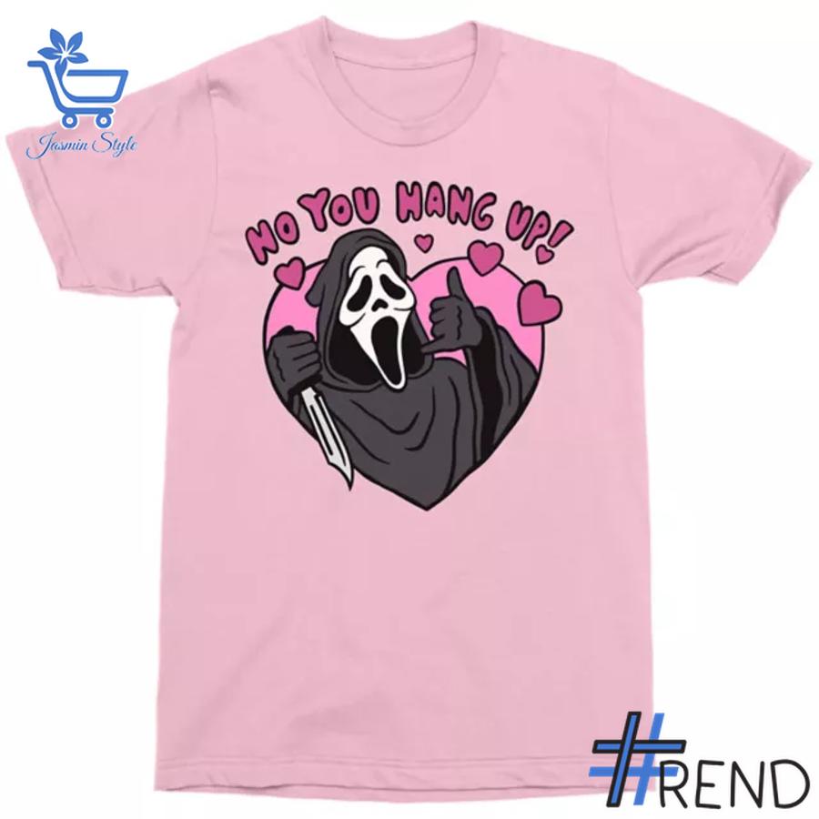 Bring a playful twist to iconic horror with the Ghost Face No You Hang Up Shirt, a must-have tee that perfectly blends spooky vibes with lighthearted charm. Featuring the infamous Ghost Face character framed in a heart with the fun phrase “No You Hang Up,” this shirt reimagines horror in a witty, lovable way. Whether you’re a fan of cult-classic slasher films or simply love bold graphic tees with personality, this shirt is the perfect pick for your collection.
