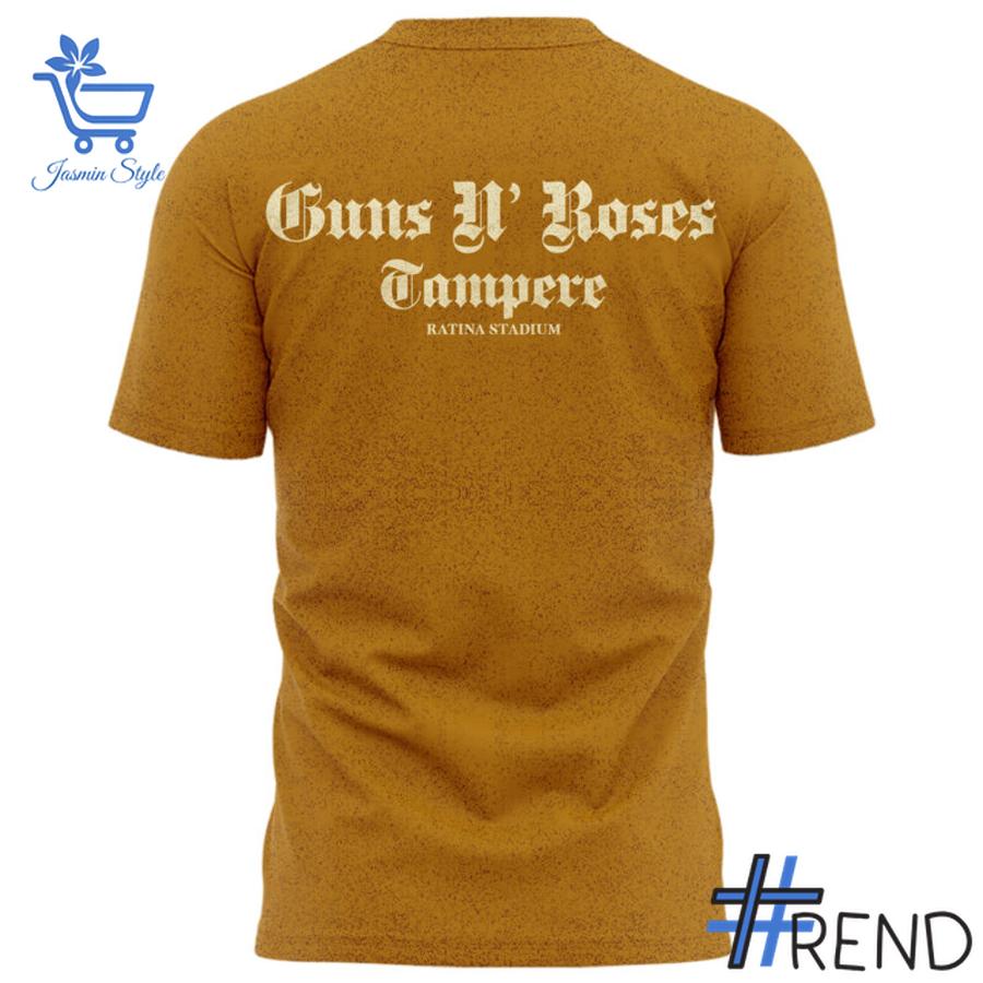 On the back, you’ll find “Guns N’ Roses Tampere” proudly displayed in bold, gothic lettering, along with “Ratina Stadium” beneath, commemorating the exact venue of this historic performance. This design element transforms the shirt into a tangible piece of the band’s touring history.