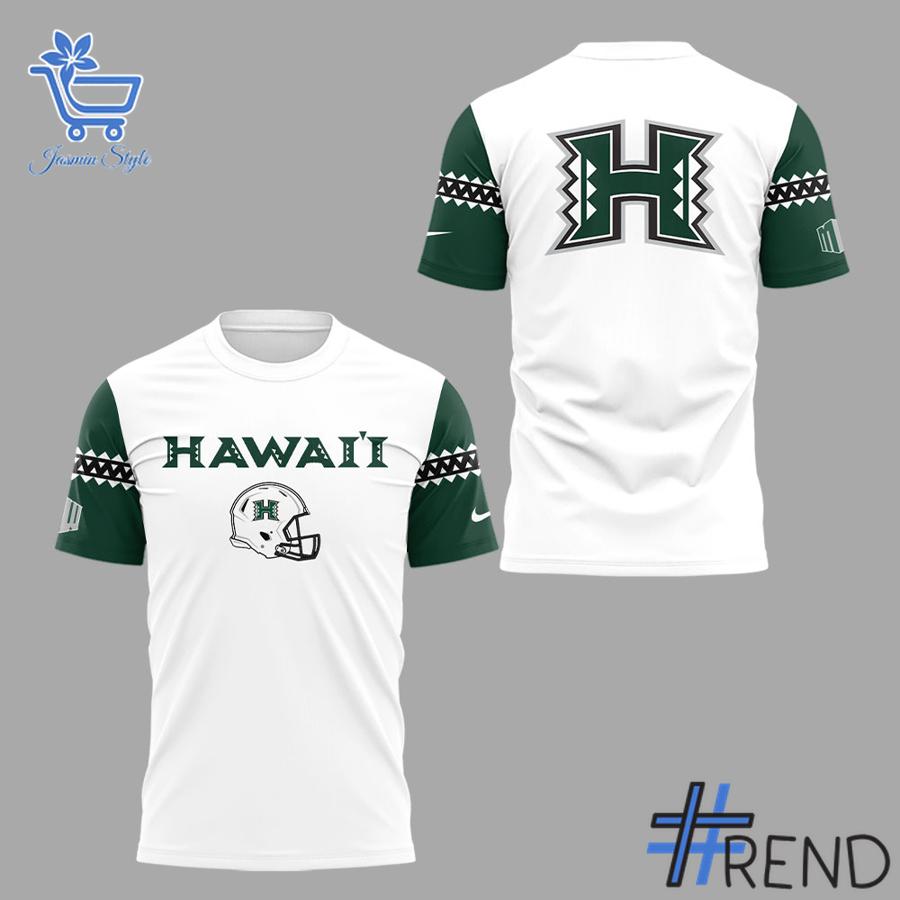 Front and center, the iconic “HAWAII” lettering stands out in bold green, instantly recognizable and proudly representing the Aloha State. On the white shirt, a miniature football helmet adorns the chest, adding a classic touch of team pride. The black version showcases the striking “H” logo, reimagined with tribal-inspired patterns that pay homage to Hawaii’s rich Polynesian heritage.