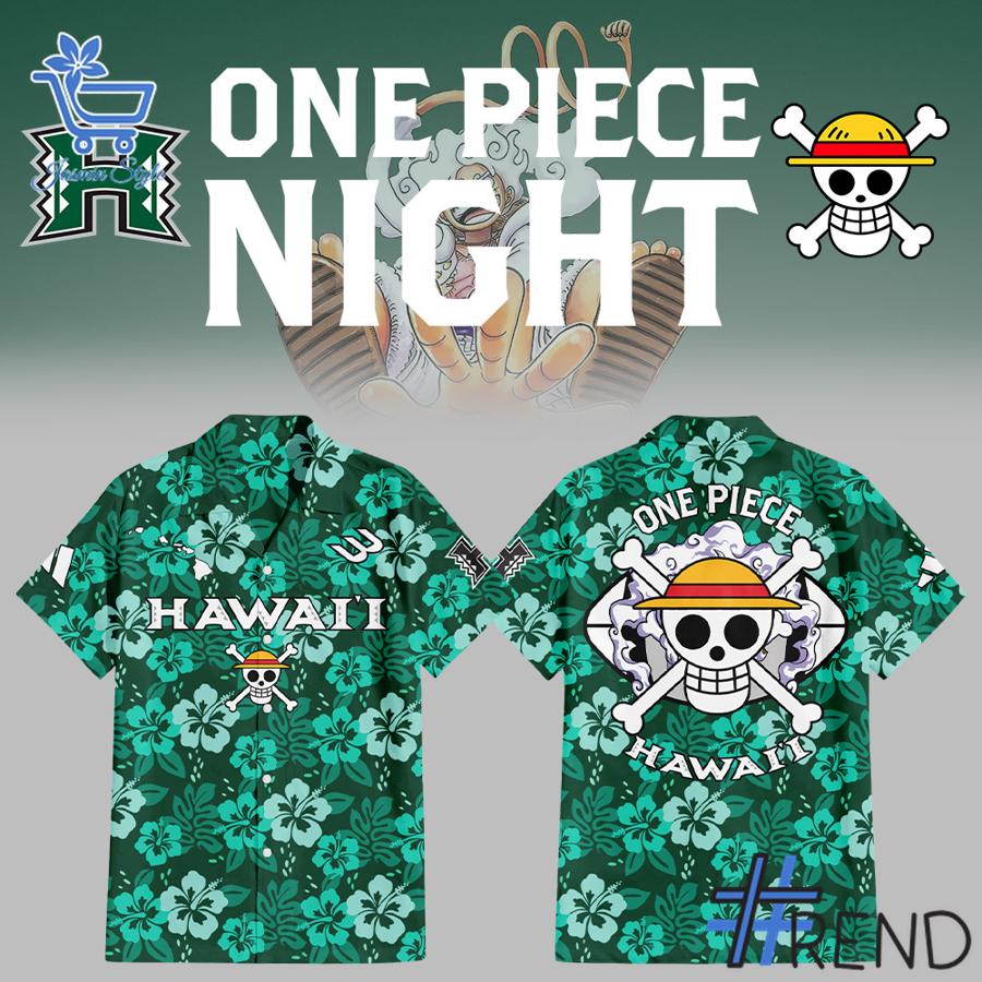 Turn heads with the shirt’s unique features. The front pocket subtly displays the One Piece skull, while the back makes a bold statement with a larger logo and “ONE PIECE HAWAII” text. Look closely, and you’ll spot the Hawaii Rainbow Warriors logo, adding a sporty touch to this already extraordinary shirt.