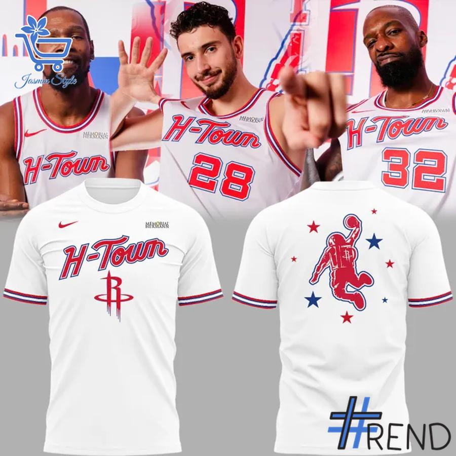 On the back, a striking throwback graphic of a dunking astronaut surrounded by stars captures the fusion of Houston’s basketball legacy and its space city identity. It’s a design that perfectly blends nostalgia and modern flair — a tribute to both Rockets history and the city’s pioneering spirit.