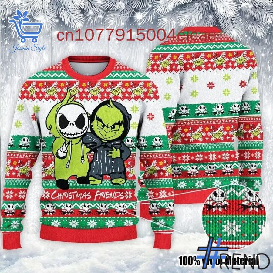 Embrace the unexpected joy of the holidays with our exclusive Jack Skellington and Grinch Christmas Friends Sweater, where two beloved holiday anti-heroes unite in a delightfully festive design that’s sure to turn heads at any seasonal gathering.