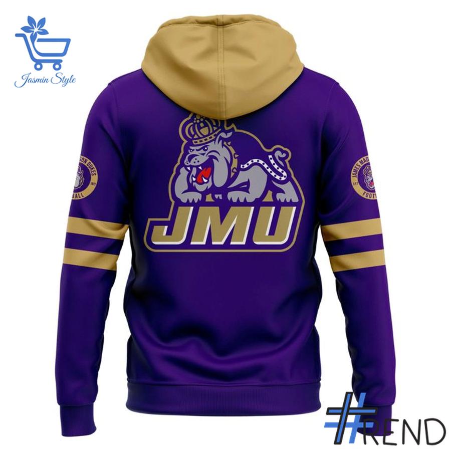 The back of the hoodie is just as impressive, showcasing the iconic James Madison Dukes bulldog mascot, regal and ready for action, topped with a golden crown. The mascot stands proudly above the golden “JMU” lettering, completing the powerful design. Made from soft, durable material, this James Madison Dukes apparel is built for comfort and will keep you warm and cozy on cooler days. Show your spirit and represent your favorite team with this must-have JMU 2025 Golden Hoodie, a perfect addition to any fan’s collection.