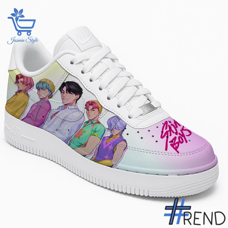 The standout feature of these shoes is the vibrant artwork adorning the sides. A group of stylish young men, each with distinctively colored hair – from pink to blue to purple – are depicted in a cool, anime-inspired style. Their fashionable outfits and confident poses embody the essence of K-Pop idol culture, making these shoes a must-have for any fan.