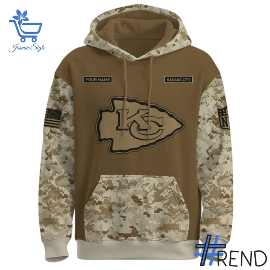 The visual design is a stunning tribute to both the Chiefs and the wild. Picture a rich tan body with camouflage-patterned sleeves and hood, evoking the feel of a forest hunt. The front proudly displays the iconic Chiefs logo in bold black, accented by an American flag patch and a “Kansas City” label for local pride. Turn it around, and you’ll see a striking deer silhouette framed by antlers and a crosshair, set against a woodland scene with “Hunting Deer” text in bold letters. The textured camouflage adds depth, while the personalized name patch on the chest makes it distinctly yours—a perfect mix of team spirit and hunting heritage that turns heads.