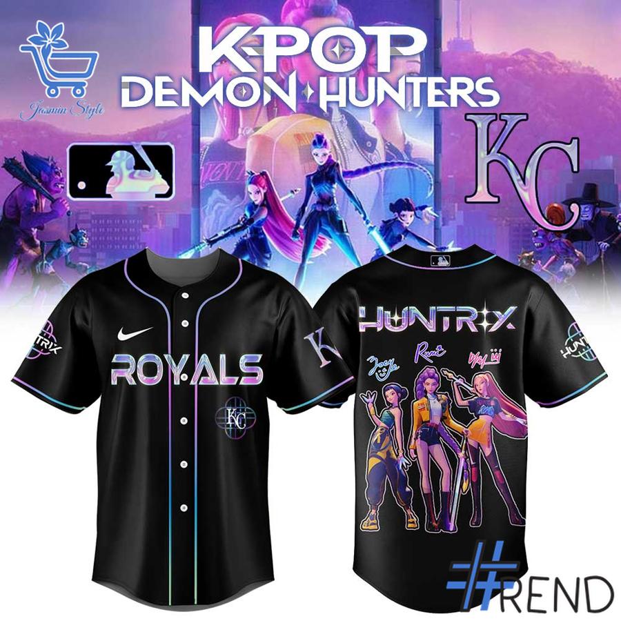 The front of the jersey proudly features the Royals name in an eye-catching, iridescent gradient that shifts with the light, giving it a futuristic, neon-inspired glow. The classic KC logo and sleeve details add authentic team spirit, while sleek black fabric provides the perfect backdrop for the vibrant design. On the back, the jersey bursts with color and energy—featuring the “HUNTRX” logo alongside striking illustrations of dynamic K-pop–styled demon hunters, complete with bold poses and intricate character details. The mix of sports and anime-inspired aesthetics creates a one-of-a-kind look that resonates with both baseball fans and pop culture enthusiasts.