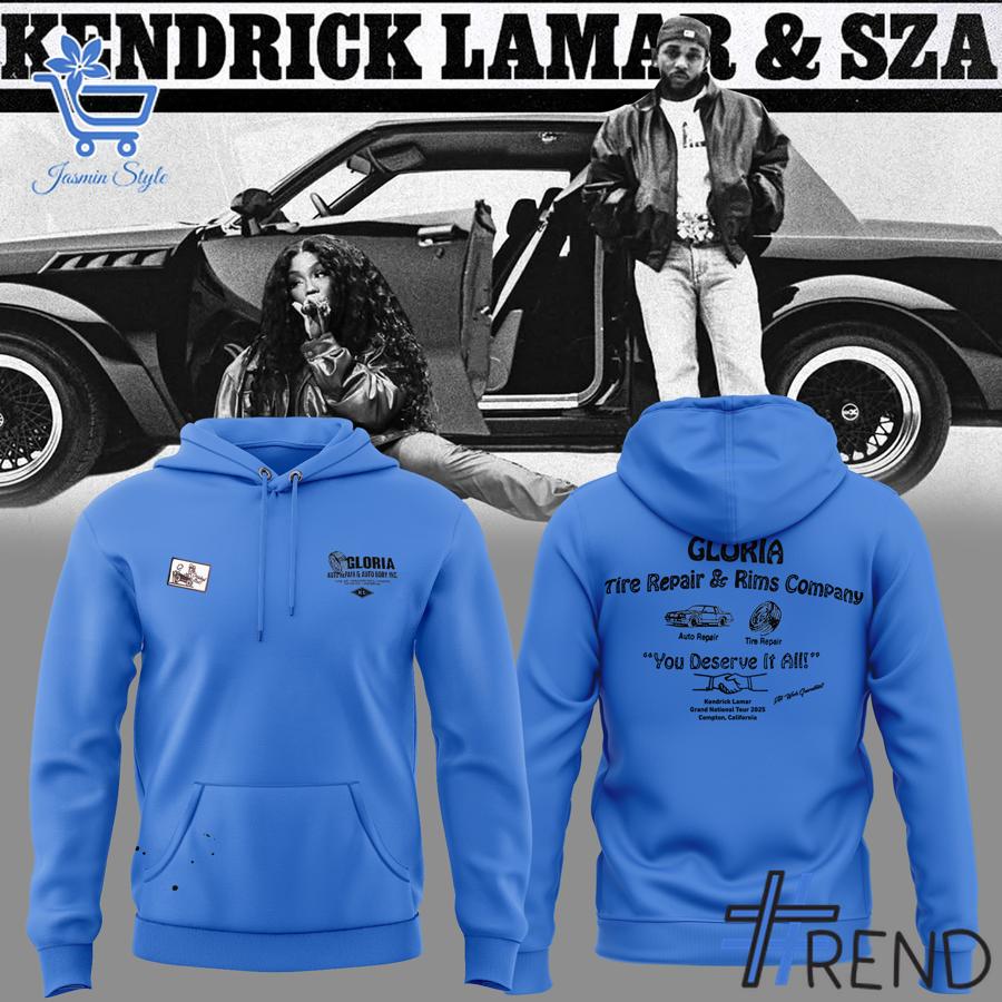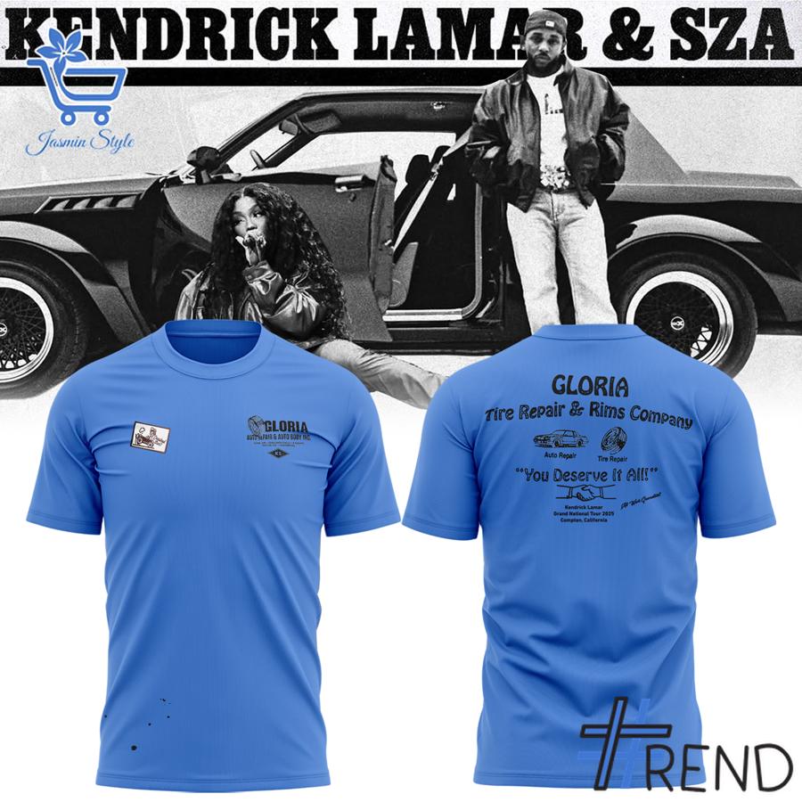 The back is where the tour merch comes to life. Centered around the “GLORIA” company theme, the print expands to include “Auto Repair” and “Tire Repair,” setting the stage for the tour concept. The true fan detail is the powerful quote, “You Deserve It All!” – a phrase that resonates deeply with the themes in both artists’ music. Below this, the graphic clearly references the fictitious “Kendrick Lamar & SZA Grand National Tour 2025,” complete with a date and the iconic location of Compton, California.