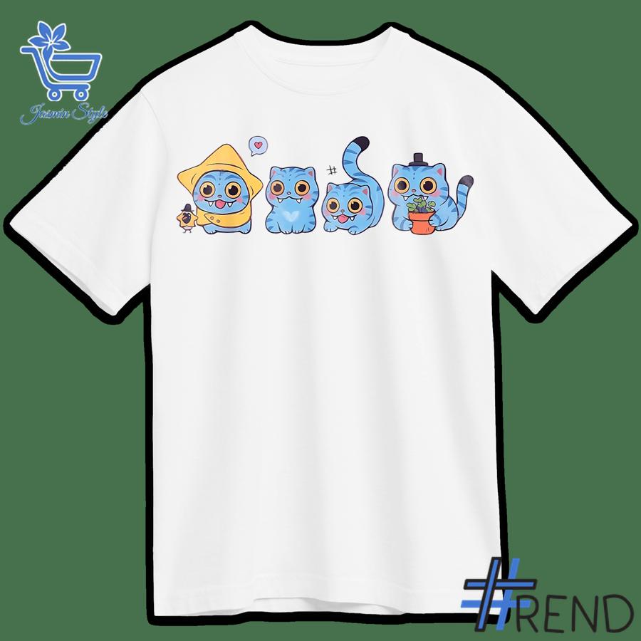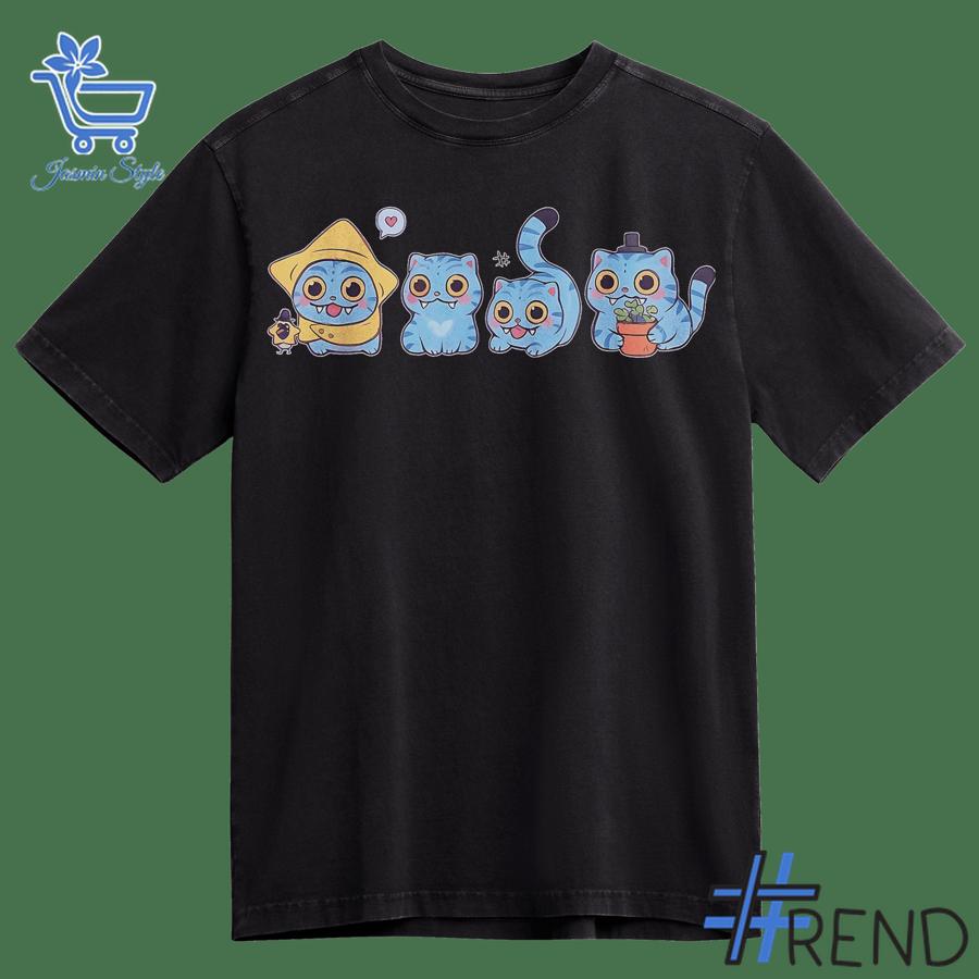 What makes this tee truly pop is the lineup of wide-eyed, blue derpy tigers playfully parading across the chest. Each tiger boasts its own personality—from the one dressed as a yellow star, clutching a microphone, to the mischievous tail-flicker and the plant-loving cutie with a flowerpot hat. The design bursts with pastel blues, purples, pinks, and yellows—subtly outlined in black for a comic-style finish. It’s the kind of print that instantly sparks joy and compliments.