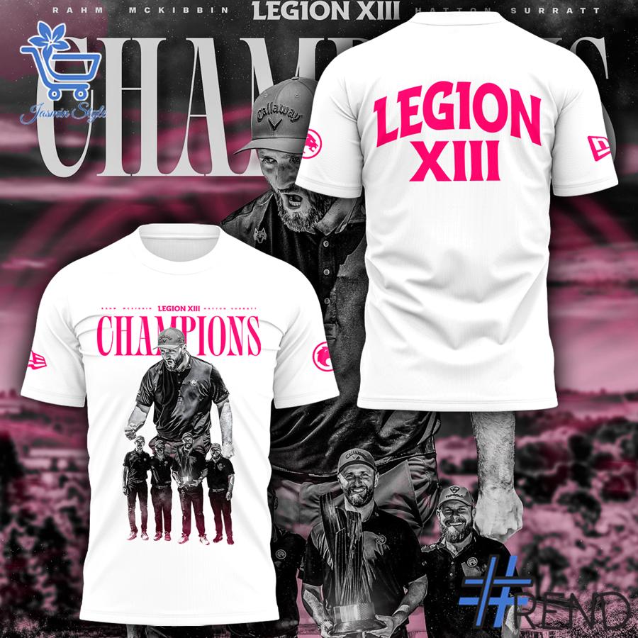 The visual design is a tribute to greatness! The white version features a bold pink “CHAMPIONS” graphic across the chest, showcasing a towering figure holding a trophy alongside his victorious team, all decked in Callaway caps. The back proudly displays “LEGION XIII” in striking pink, adding a dynamic flair. The black variant mirrors this with a powerful image of the team lifting their trophy, framed by the same vibrant “CHAMPIONS” text and “LEGION XIII” on the back. Subtle details like the Callaway logo and team imagery bring depth, set against a dramatic sunset backdrop that evokes the thrill of victory. Every stitch radiates pride and passion.