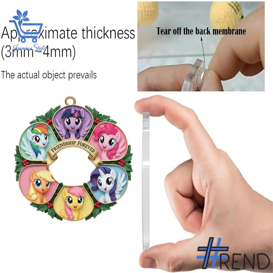 These high-quality mica acrylic ornaments catch and reflect light beautifully, adding an extra touch of magic to your holiday decorations. The pieces range from single character poses to elaborate winter scenes with multiple ponies and detailed backgrounds, each crafted with precision and care.