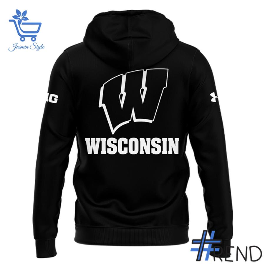 The hoodie features a sleek black base that exudes strength and sophistication. The front showcases a striking emblem with a skull-wearing beret, crossed rifles, and lightning bolts, encircled by “Badgers Strength” and “Do Tough Things G.A.M.” in bold white lettering, symbolizing resilience and grit. The back proudly displays a large white “W” above “WISCONSIN” in all caps, paired with the Under Armour logo on the sleeve for an authentic touch. The kangaroo pocket and adjustable drawstrings add practical style, while the overall design mirrors the intensity Coach Fickell brings to the field. Picture yourself wearing this as you rally with fellow fans, the vibrant details popping against the dark fabric.