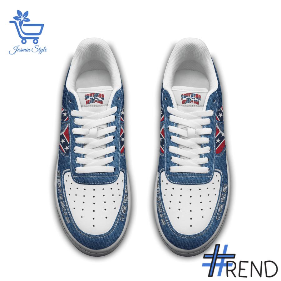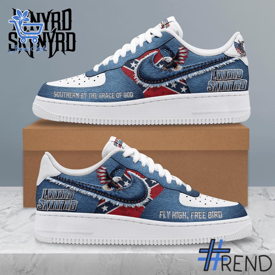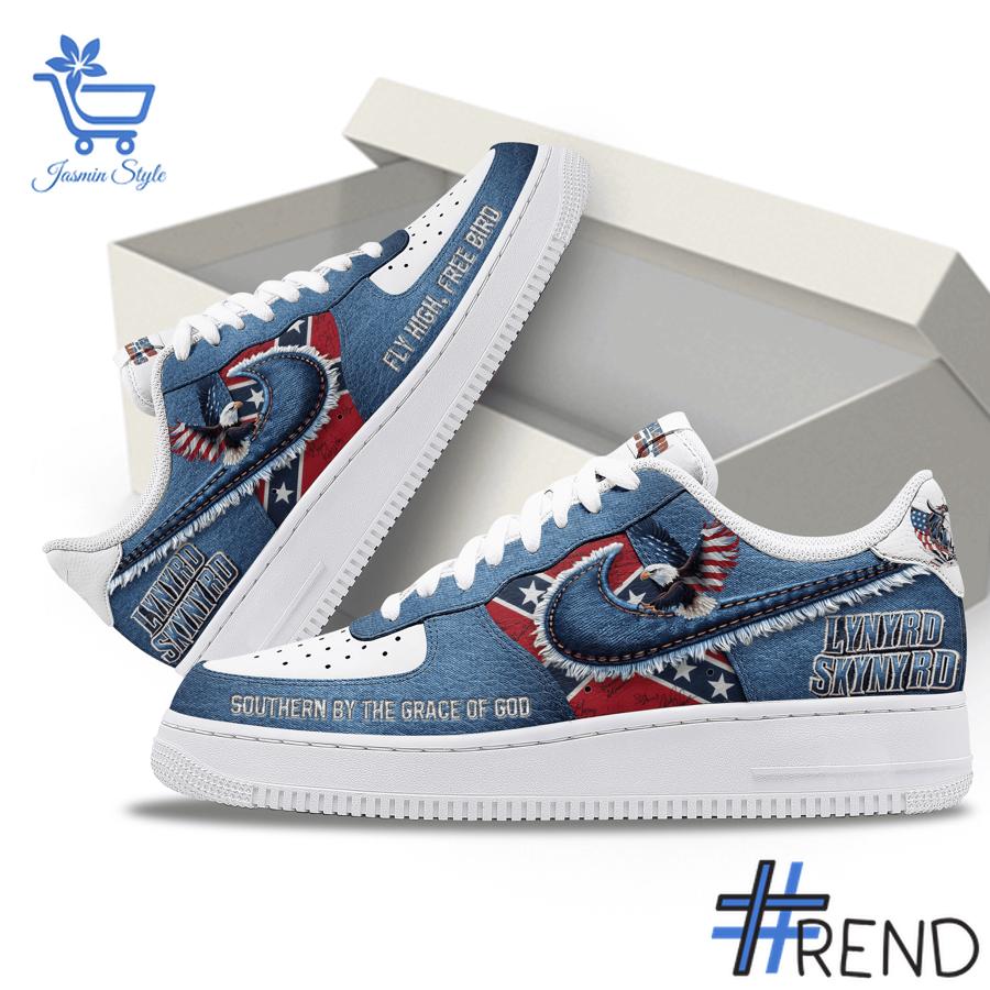 Visually, these sneakers are a high-octane canvas of Southern swagger that screams Lynyrd Skynyrd without a single note. The base dives into deep indigo denim with frayed edges for that lived-in, road-worn charm, accented by crisp white midsoles and laces that ground the boldness. One side roars with “Southern by the Grace of God” scripted in elegant white along the heel, while the tongue proudly declares “Lynyrd Skynyrd” in arched, metallic lettering. The real showstoppers? A majestic American eagle with outstretched wings, talons gripping a Confederate battle flag in fiery reds and blues, perched dynamically over the Nike swoosh—symbolizing untamed freedom. Flip to the other side for “Fly High, Free Bird” embroidered in flowing script, evoking the band’s soaring guitar solos, with subtle star patterns adding a starry-night texture. It’s a balanced riot of patriotic motifs and rock motifs against the denim’s subtle sheen, detailed perforations for breathability, and a gum outsole that grips like gravel under truck tires. Every element stirs that nostalgic fire, making you feel invincible, like you’re onstage with the band.