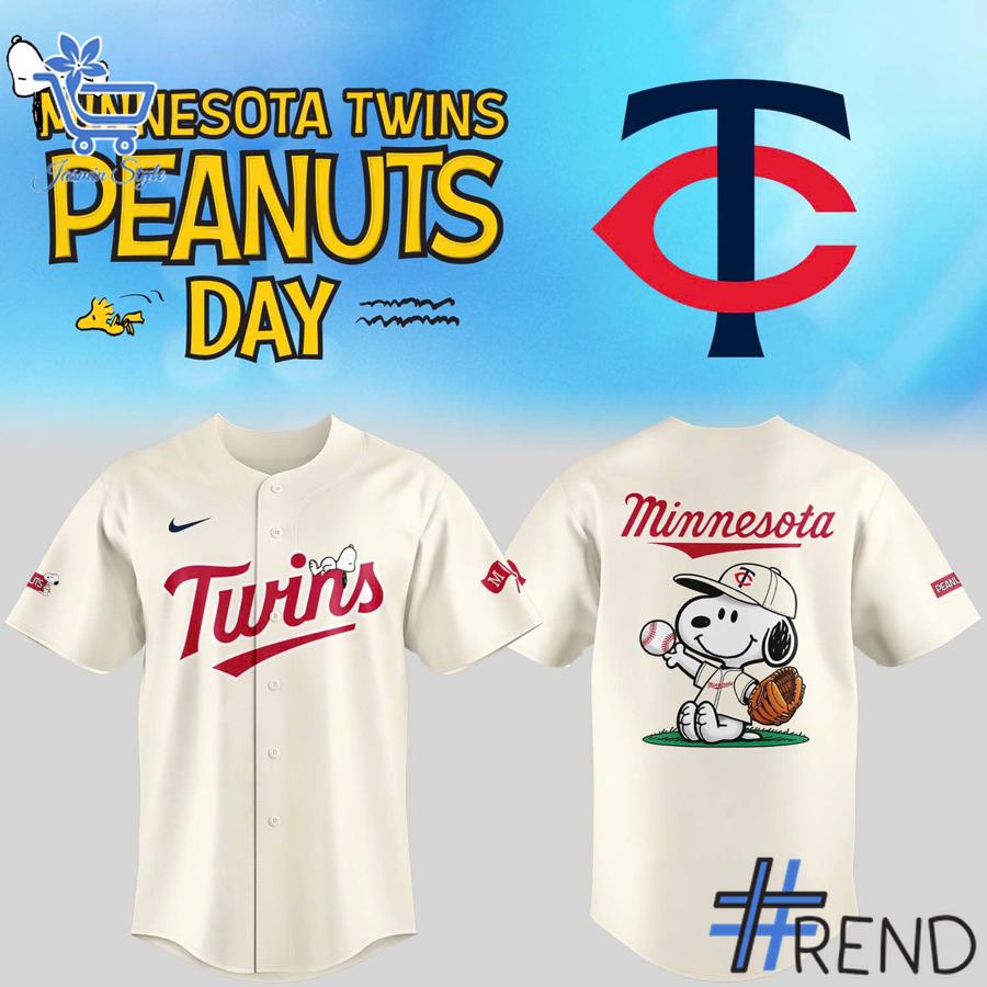 As seen in the image, this cream-colored baseball jersey offers a classic, timeless look that’s both fresh and familiar. The front proudly features “Twins” in elegant red script across the chest, echoing the team’s iconic aesthetic. Subtle details like the Nike swoosh and an MLB logo on the sleeve add authentic touches. The real star, however, is on the back: a delightful graphic of Snoopy himself, dressed in a baseball cap, ready to pitch or catch, showcasing his timeless appeal. Above him, “Minnesota” is elegantly scripted, ensuring your team loyalty is clear. The collaboration artwork for “MINNESOTA TWINS PEANUTS DAY” is also visible in the background of the image, setting the scene for this special edition item.