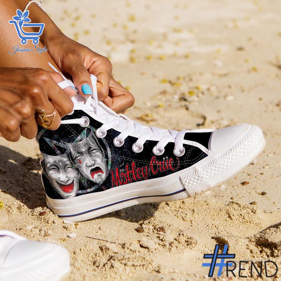 Inspired by the raw energy of Mötley Crüe, these high-top canvas shoes feature a captivating, distressed black background that gives them a vintage, worn-in look. The main attraction is the band’s famous tragedy and comedy masks logo on the outer ankle, rendered in striking detail with red and white accents that pop against the dark canvas. The band’s name, Mötley Crüe, is emblazoned in a bold red font below the masks, ensuring your allegiance is clear. A classic Chuck Taylor All Star-style patch on the inner ankle completes the design, featuring the band’s name and iconic masks once more.