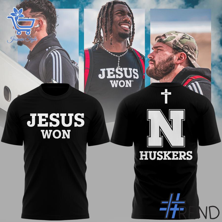 On the front, the bold “JESUS WON” lettering stands strong in crisp white print against a deep black background—simple, striking, and impossible to ignore. It’s more than just a slogan; it’s a declaration of faith and triumph. Flip to the back, and you’ll find the unmistakable block “N” logo paired with “HUSKERS” beneath it, a proud nod to Nebraska football tradition. A subtle white cross above the design ties together the message of belief, strength, and unity that defines every Huskers fan.