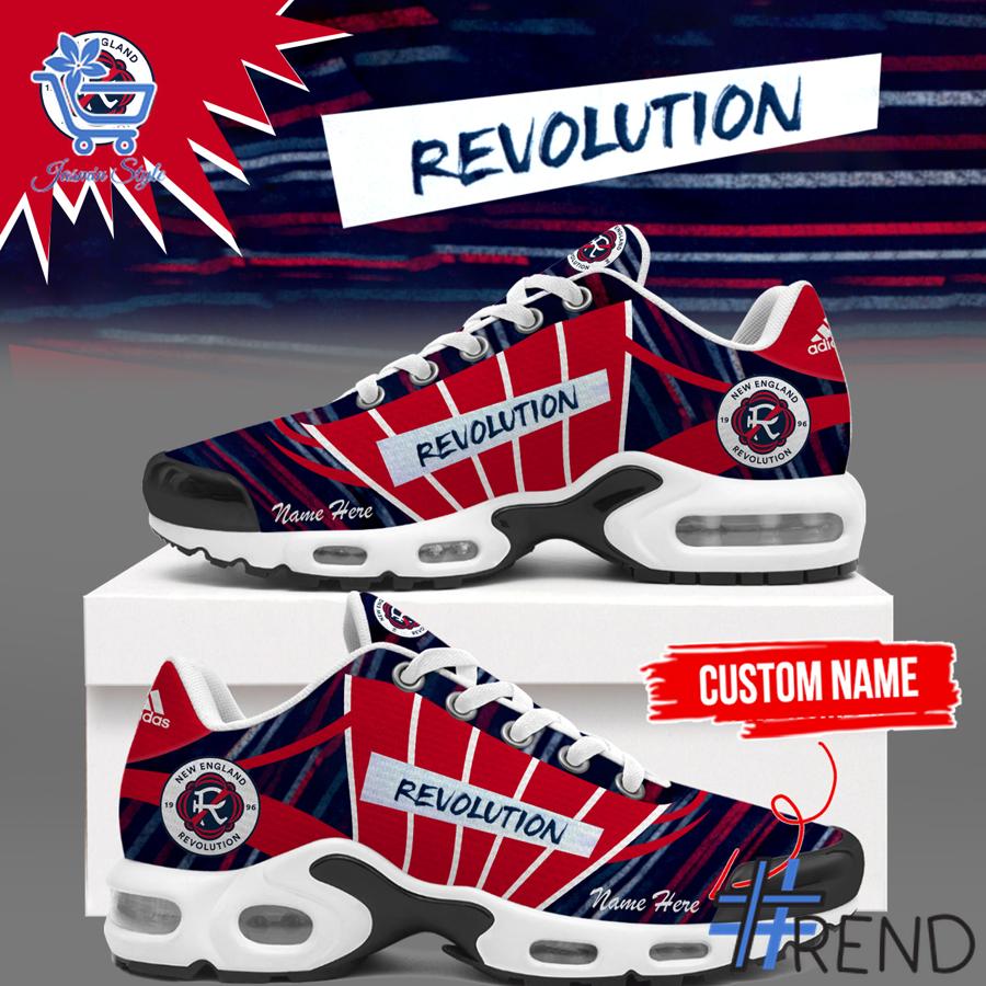 These New England Revolution shoes boast an energetic design inspired by the team’s iconic colors. The upper features a captivating blend of deep navy blue, bold red, and crisp white, intricately woven into a striped pattern that mimics the team’s energetic spirit. A prominent white band crosses the midfoot, emblazoned with “REVOLUTION” in a striking black font, leaving no doubt about your allegiance. Adding a personalized touch, a “Name Here” placeholder beneath this band indicates the exciting opportunity for custom New England Revolution sneakers, making your pair truly one-of-a-kind. The official New England Revolution crest is proudly displayed on the heel, a mark of authentic team support. The classic Air Max TN sole, with its visible air units in the heel and forefoot, provides that renowned cushioning and comfort, making these shoes perfect for all-day wear.