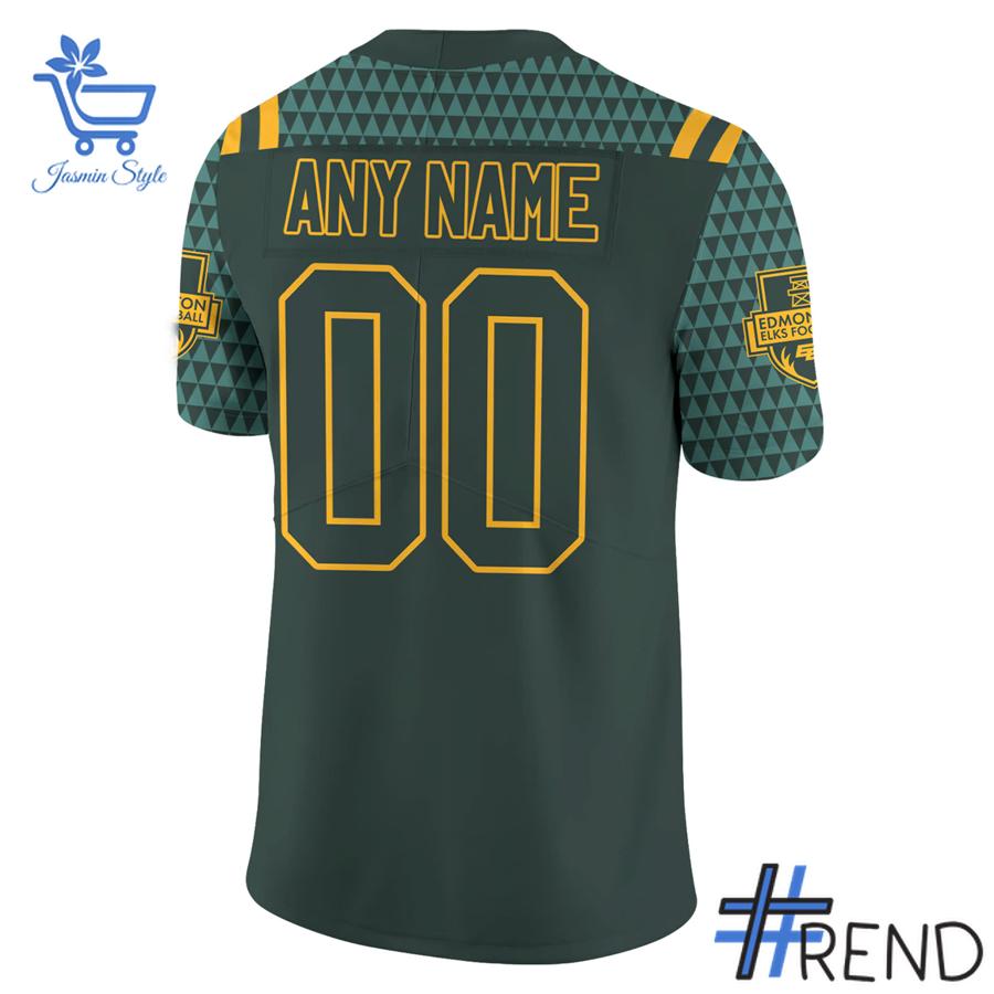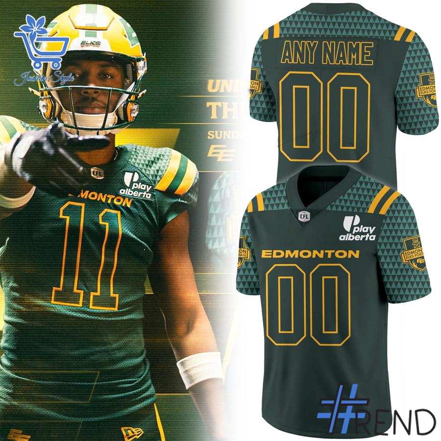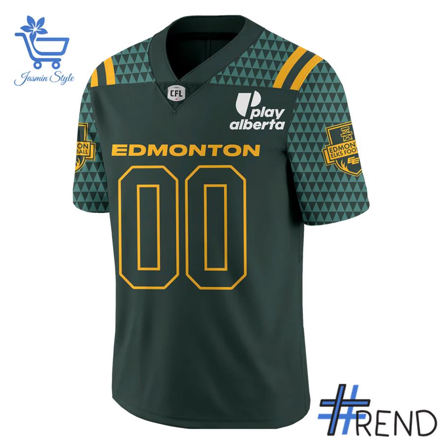 The jersey features a striking dark green base color, emblazoned with bold gold accents that make it stand out in any crowd. A distinctive geometric triangle pattern adorns the shoulders and upper chest, adding a modern twist to the classic football jersey design. The team name “EDMONTON” is prominently displayed across the chest in vibrant gold lettering, leaving no doubt about where your loyalties lie.