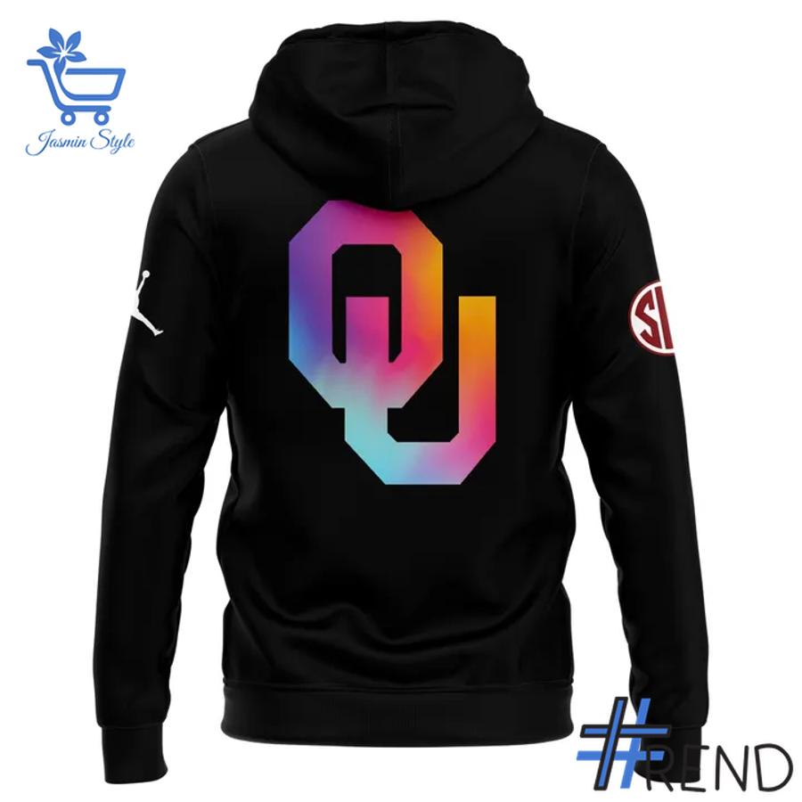 This high-quality Oklahoma football apparel features a striking design that instantly grabs attention. The hoodie is primarily a sleek, dark color—likely black or charcoal—providing a sharp contrast to the bold, team-specific graphics. At the chest, the iconic Oklahoma Sooners logo is prominently displayed, surrounded by a vibrant, multi-colored ribbon design. This multicolor cancer awareness ribbon represents the spectrum of cancers fought under the Crucial Catch program, beautifully integrating the team’s identity with the cause.