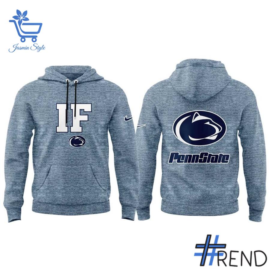 Pulled straight from the image’s raw, real-life energy, picture a heathered gray canvas that mimics the misty mornings of Mount Nittany, textured with subtle flecks for that lived-in, authentic feel. Bold white “IF” lettering dominates the chest like a defiant shout, paired with the snarling Nittany Lion head in crisp navy—eyes fierce, paws ready to pounce. Flip it back, and “Penn State” arches in oversized navy script above the full lion emblem, encircled in white for pop, with Nike Swoosh accents on the sleeves nodding to elite performance. The athlete model in headphones adds street-ready edge, capturing that pre-game focus vibe that turns heads and sparks nods of recognition.