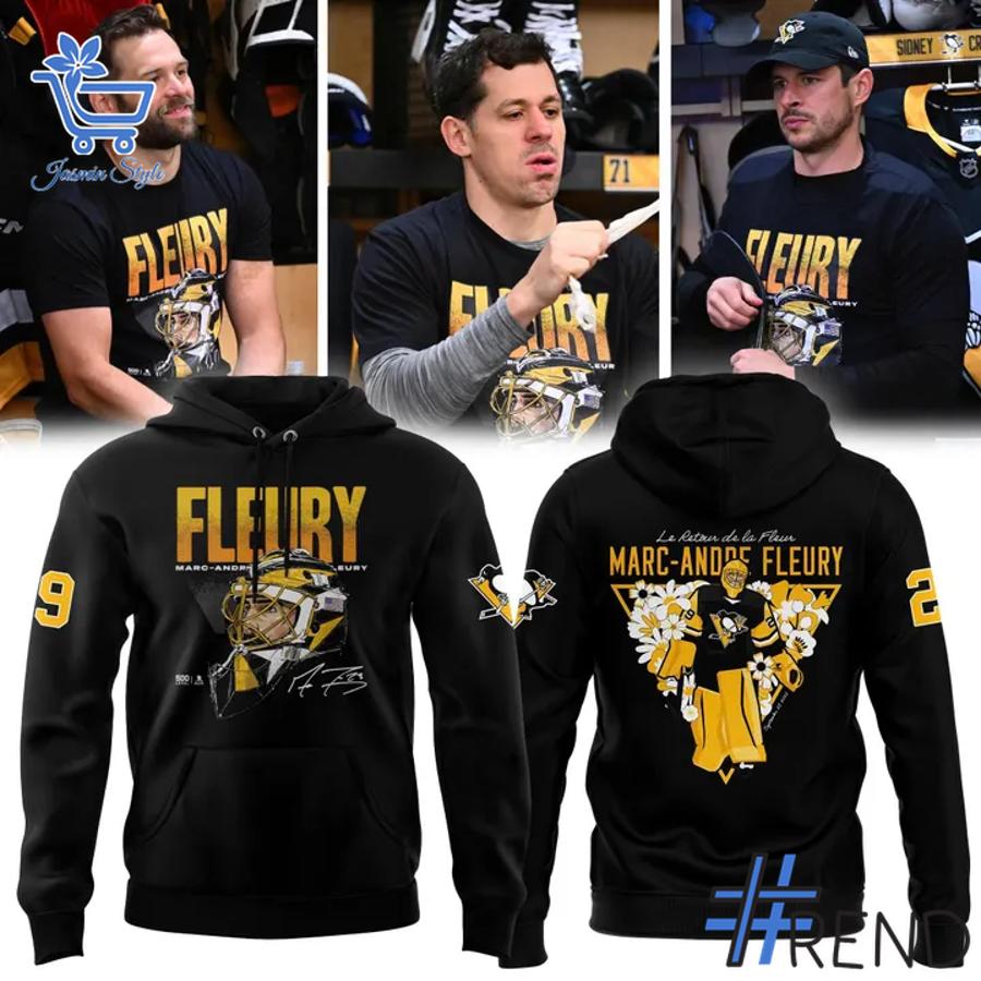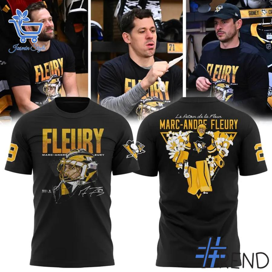 The front of this vibrant yellow shirt features an eye-catching design of Fleury in action, complete with his name and signature boldly displayed above the iconic Penguins logo. The back continues the tribute with an artistic illustration of Fleury surrounded by flowers—symbolizing his nickname “The Flower”—and accented by the phrase Le Retour de la Fleur for an extra touch of nostalgia and pride.