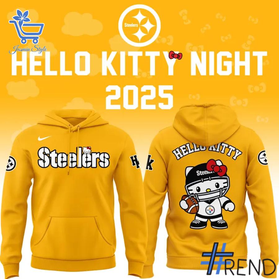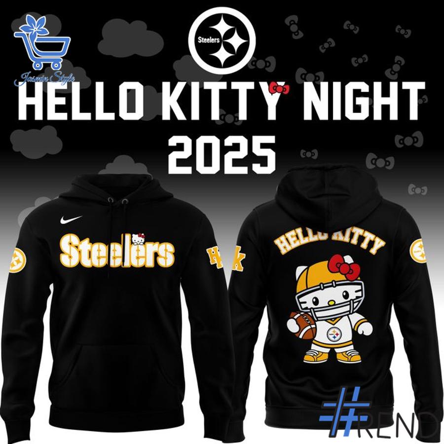 Turn it around for the showstopper: a full-back graphic of Hello Kitty suited up as a mini Steeler—yellow helmet gleaming, football tucked under one paw, cleats planted firm in black turf—framed by “HELLO KITTY NIGHT 2025” in bubbly lettering that pops against the sleek black base. This 2025 Pittsburgh Steelers hoodie isn’t just merch; it’s a conversation starter that blends the franchise’s storied legacy—think Franco Harris magic—with Hello Kitty’s 50-year reign of joy, sparking smiles amid the “Here We Go” chants. Picture yourself leading the charge at the next home opener, your hoodie a beacon of fun fandom that unites kids, collectors, and coordinators in unbridled team spirit.