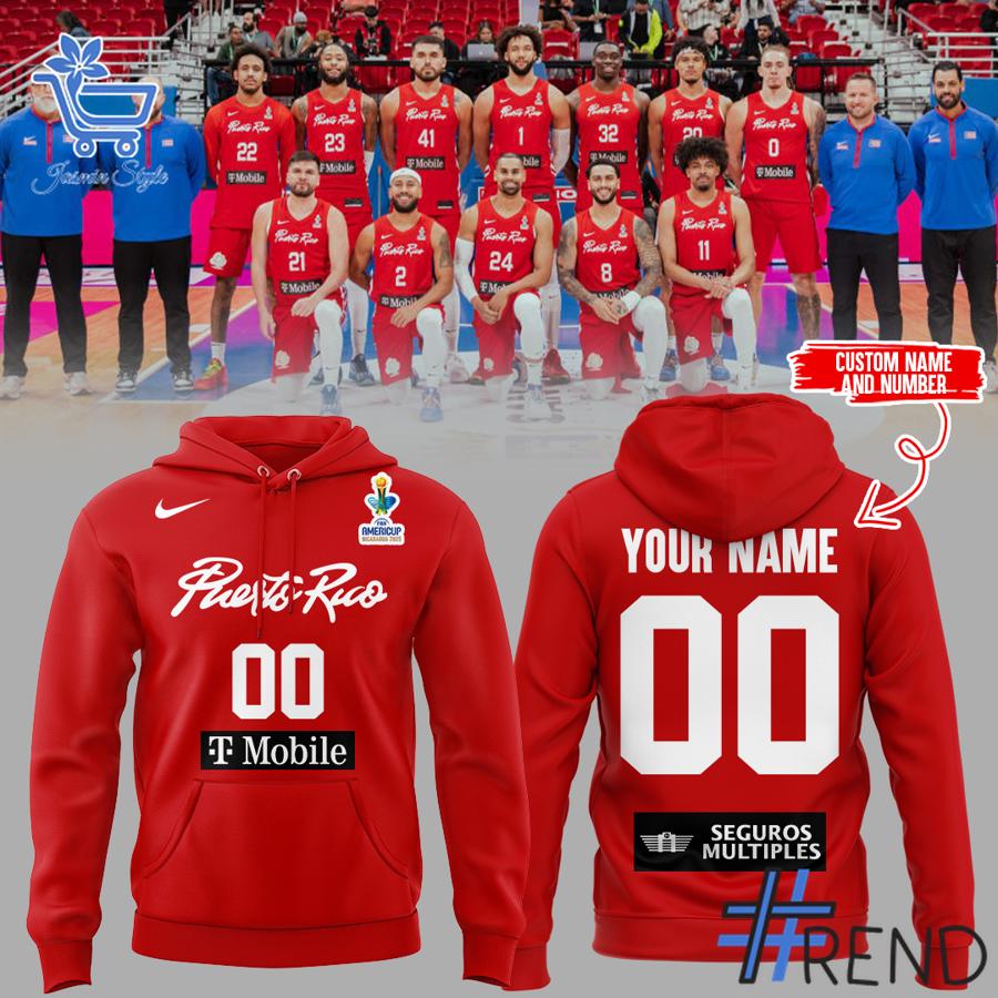 Crafted from premium, soft fleece, the Puerto Rico 2025 FIBA AmeriCup Hoodie offers exceptional comfort and durability, ideal for game days at the Polideportivo Alexis Argüello or casual wear. The front proudly displays “Puerto Rico” with the T-Mobile logo, alongside the AmeriCup emblem, while the back allows for a custom name and number, personalizing your support for stars like José Alvarado. The adjustable hood and kangaroo pocket enhance its practicality, and the fade-resistant print keeps the bold design vibrant wash after wash, reflecting the team’s podium-contending spirit.