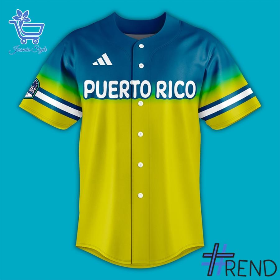 This jersey’s design is a striking and powerful tribute to the Puerto Rican flag and the team’s relentless energy. The upper half is a brilliant royal blue, providing a bold and classic sports look. This transitions seamlessly into a sunny, vibrant yellow on the lower half, creating a captivating gradient effect that mirrors the beautiful coastal waters and warm spirit of Puerto Rico. The sleeves feature athletic stripes in alternating blue, green, and yellow, adding a dynamic flair and a pop of color that makes this jersey truly unique.