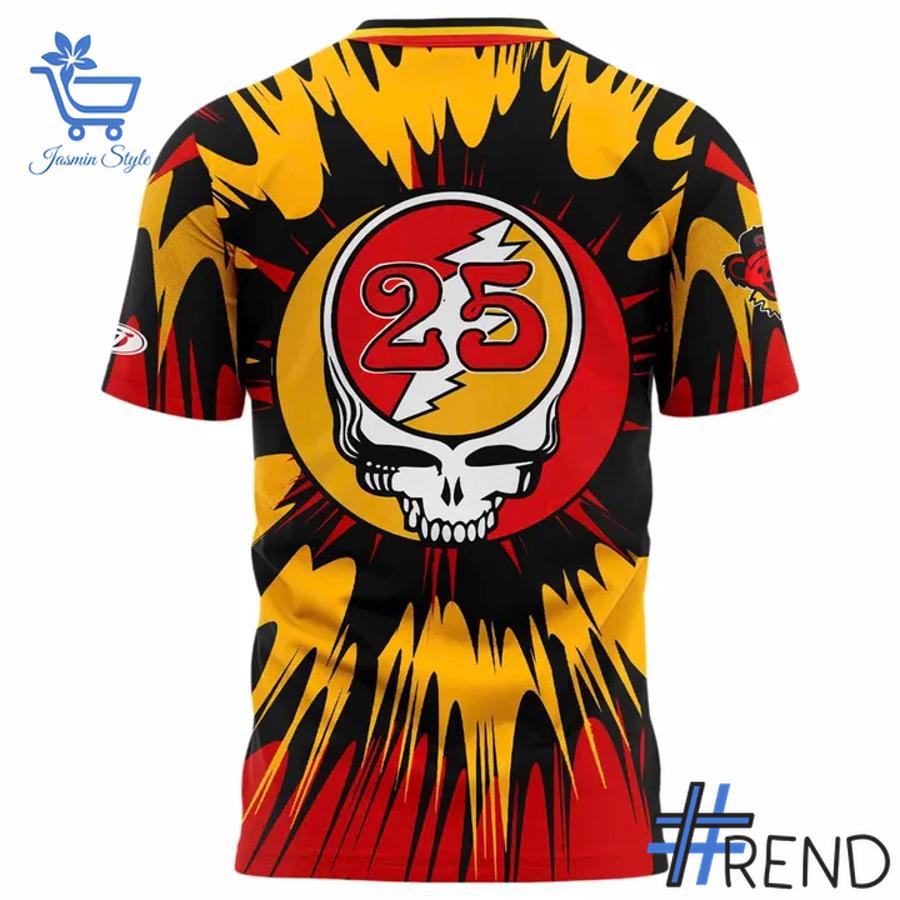 This limited-edition tee bursts with psychedelic tie-dye patterns in fiery shades of red, yellow, and black, creating a dynamic explosion of color that captures the essence of both the Grateful Dead’s free spirit and the Red Wings’ unstoppable passion. On the front, the iconic Grateful Dead “Steal Your Face” skull features the Rochester Red Wings logo at its center—an electrifying blend of sports heritage and counterculture cool. The back showcases a bold 25th anniversary skull emblem, paying tribute to the team’s legacy and the enduring influence of rock history.