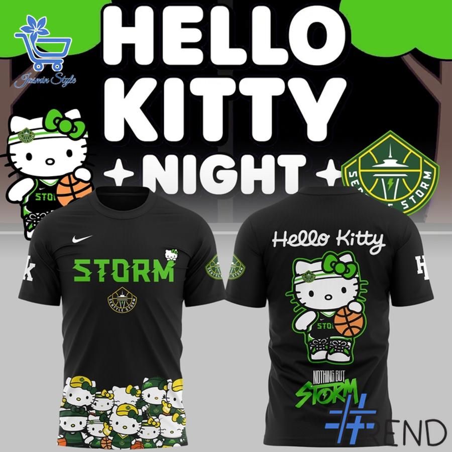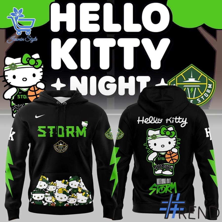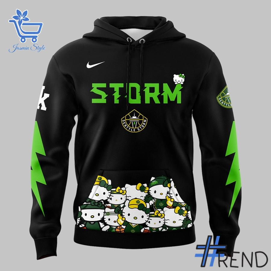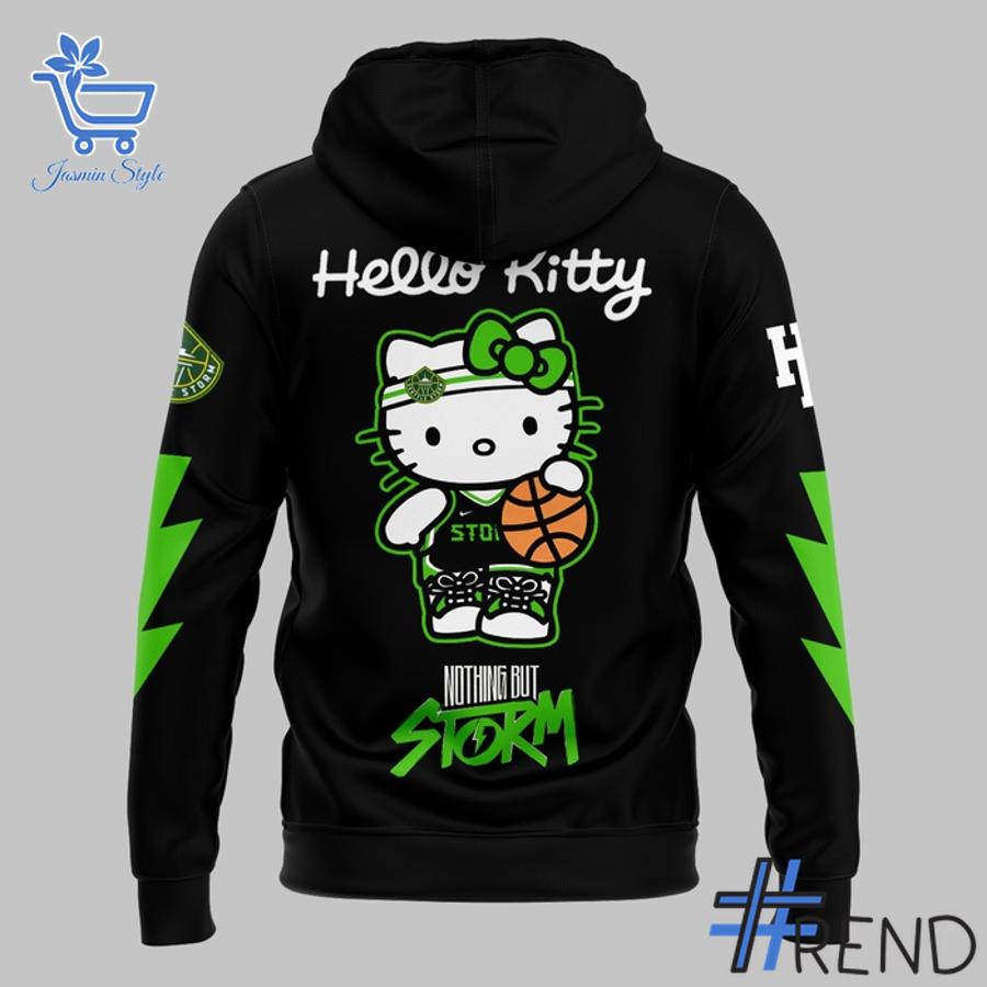 The back of the hoodie is a true fan favorite. It features a large, charming graphic of Hello Kitty herself, dressed in a full Seattle Storm uniform and holding a basketball. The details are incredible, from her tiny headband with a green bow to the determined look on her face. The words “Hello Kitty” are written in a lovely cursive font above the graphic, while “NOTHING BUT STORM” is printed below, a fun and spirited play on words. On the sleeves, more lightning bolt graphics, along with the Storm logo and the letters “H” and “K” for Hello Kitty, complete the look.