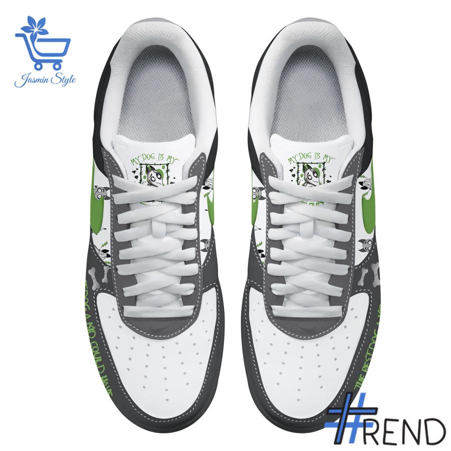 The visual design is a a masterpiece of monochrome and vibrant detail. The base of the shoe is classic white, providing a perfect canvas for the intricate graphics. A grayscale pattern of dog bones and silhouettes of Sparky himself covers the sides, creating a subtle yet captivating backdrop. The design comes alive with a striking neon green Swoosh, which adds a pop of electrifying color. The word “SPARKY” is boldly printed on the side in the same vibrant green, ensuring his name is front and center. Images of Sparky in various animated poses, along with the film’s title, “FRANKENWEENIE,” are creatively integrated across the shoe. The phrase “THE BEST DOG A KID COULD HAVE” is printed in a stylized font, a touching tribute to the movie’s central theme. The combination of black and white graphics with the neon green accents makes for a visually stunning and conversation-starting design.