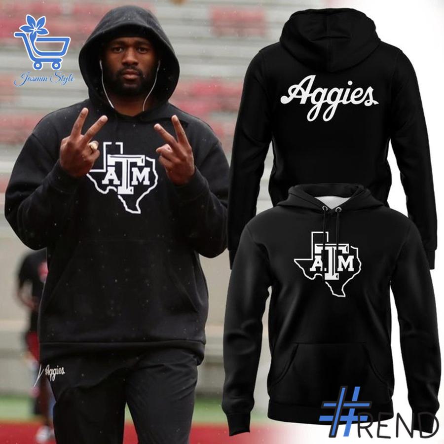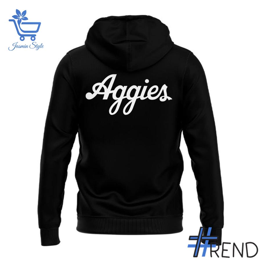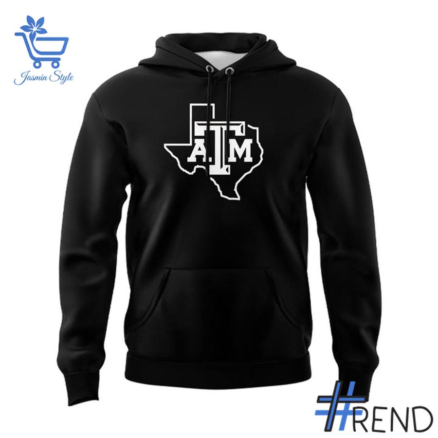This premium black hoodie showcases a bold, striking design with the distinctive Texas A&M logo incorporated into the state of Texas outline in crisp white graphics on the front. The back features an elegant “Aggies” script lettering, adding a classic touch to this modern piece. Both elements pop brilliantly against the rich black background, creating a powerful visual statement.