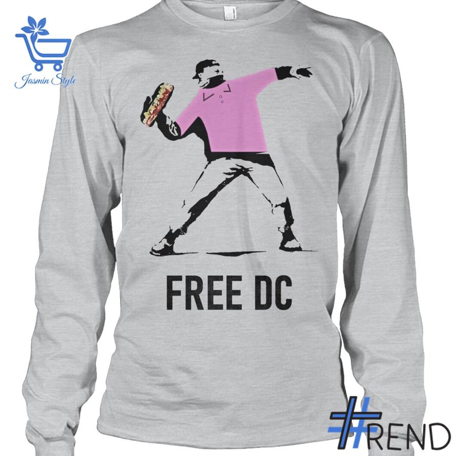 This unique tee features a powerful design directly inspired by the iconic street art that immortalized the moment. The graphic is a striking parody of Banksy’s famous “Flower Thrower” mural, where a masked protester is captured in mid-throw—except here, the bouquet of flowers is replaced by a perfectly-wrapped sandwich. The design is a brilliant fusion of urban art and political satire, a testament to the community’s creative resistance. The Free DC slogan is prominently displayed, transforming this shirt into a symbol of the fight for statehood and local autonomy.