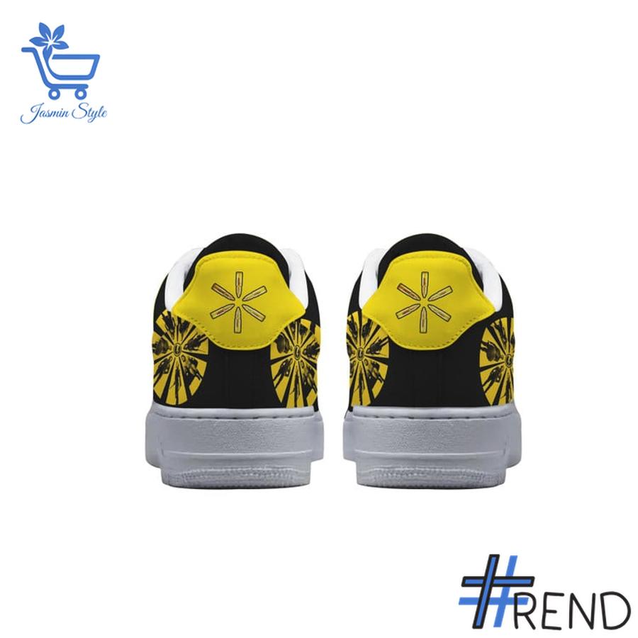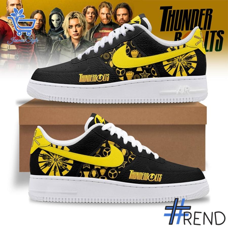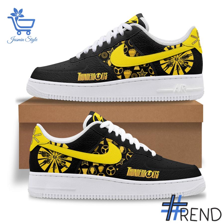 The design packs a punch with a dynamic black and yellow color scheme, accented by a bright yellow swoosh and the official Thunderbolts logo boldly printed on the side. Vibrant iconography referencing each team member forms a collage across the upper, making this shoe a wearable tribute to the darker side of the Marvel Universe. The black leather base adds a rugged texture, while the contrasting white midsole delivers timeless Air Force 1 appeal.