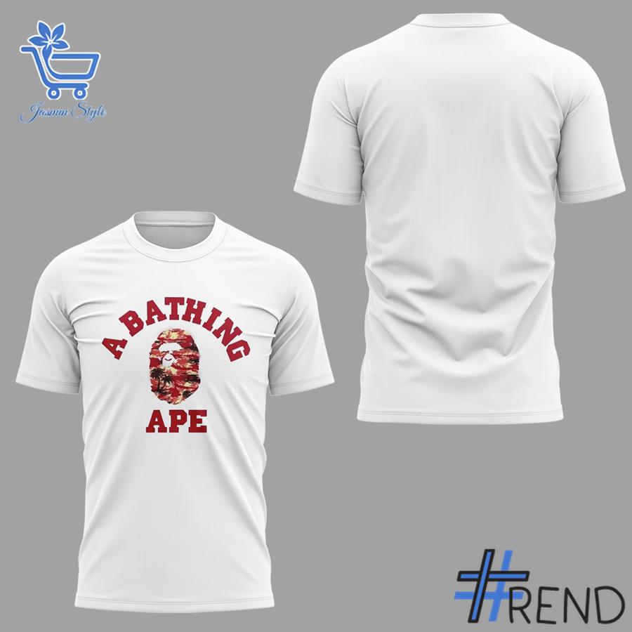 At first glance, the shirt commands attention. The crisp white cotton base serves as the perfect backdrop for the bold “A BATHING APE” lettering in rich red arching over the signature camo ape head graphic. But look closer — the camo isn’t ordinary. It’s a fiery blend of red, white, and black tones that echo the fearless style of Tina Snow herself. The contrast creates a visual punch that’s both classic and cutting-edge, ideal for those who refuse to blend in.