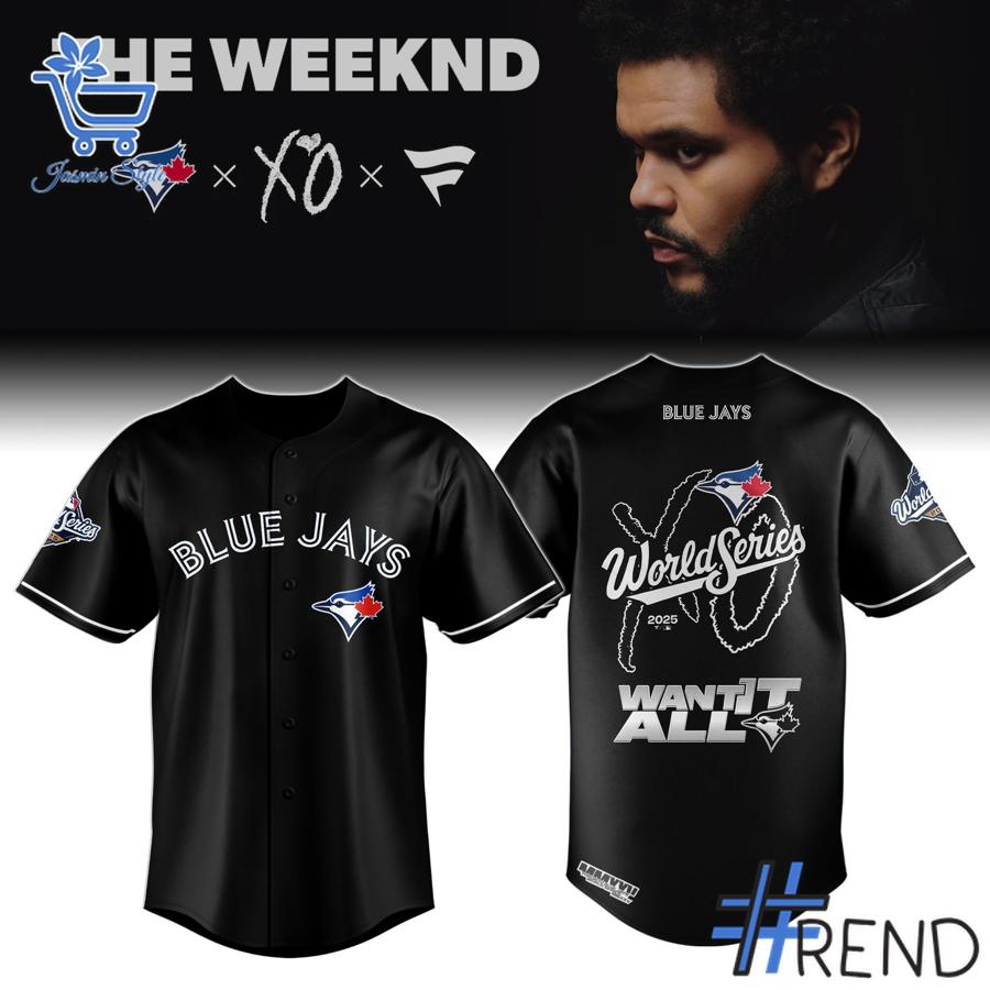 The back is where this The Weeknd XO jersey truly shines: a bold, commemorative graphic proclaims “World Series” with the year “2025” underneath, encircled by The Weeknd’s unmistakable XO logo. Below, the powerful message “WANT IT ALL” is emblazoned, capturing the spirit of a champion. The top back collar includes a subtle “BLUE JAYS” wordmark, reinforcing the team connection. This baseball jersey is an artistic blend of official team aesthetics and high-fashion streetwear, making it a standout piece of music and sports merchandise.