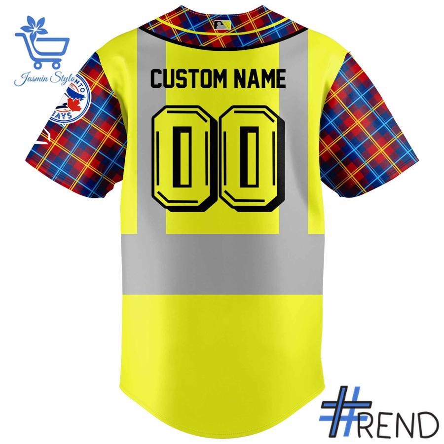 The sleeves are a true highlight, boasting a dynamic plaid pattern in shades of red, blue, and black, adding a pop of color and a rugged, workwear-inspired charm. On the left sleeve, the iconic Toronto Blue Jays logo is proudly displayed, seamlessly integrating the team’s identity into this creative design. The collar also features this same striking plaid pattern, tying the whole look together. You can even customize it with your own “CUSTOM NAME” and “00” number, making this 2025 Blue Jays Construction Night apparel truly your own!