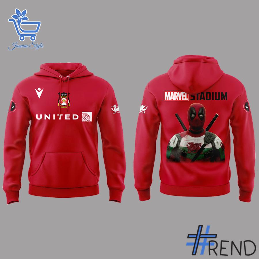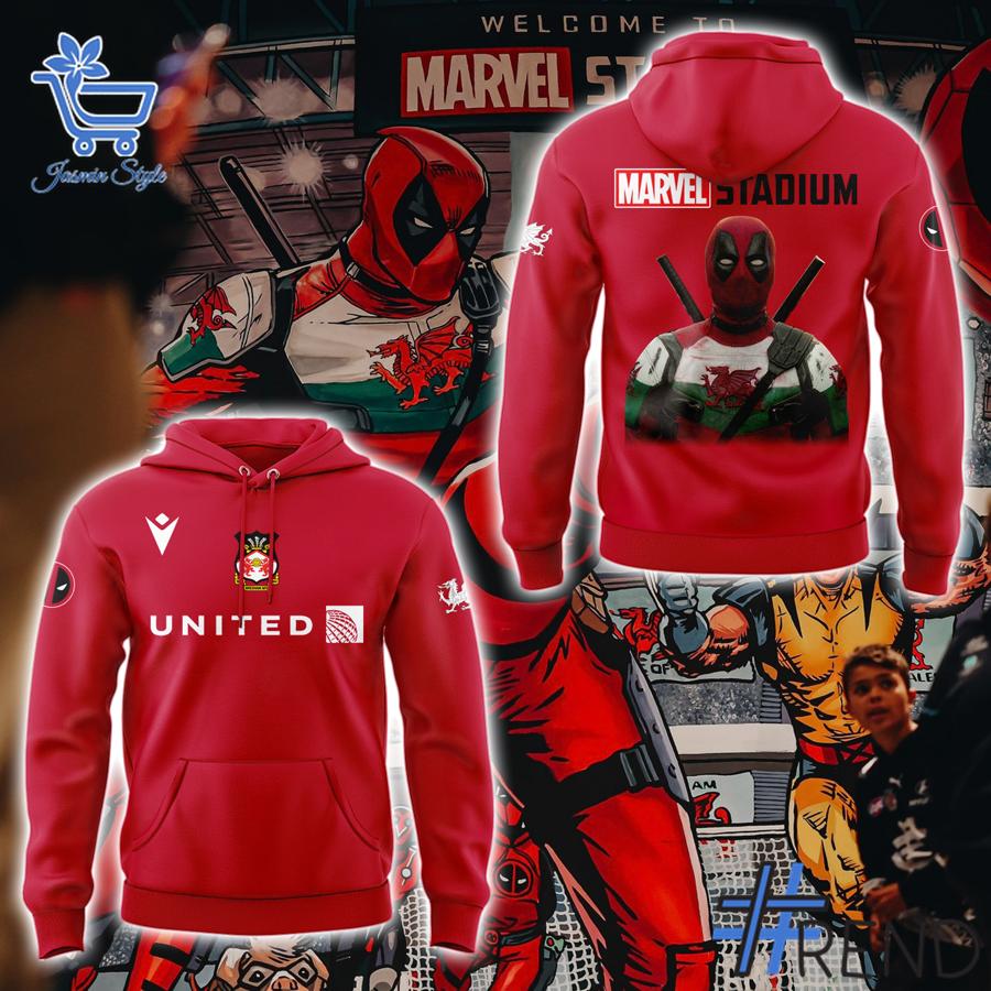 But the real showstopper is on the back! Prepare to be amazed by an epic graphic of the Merc with a Mouth himself, Deadpool, sporting a Wrexham-themed kit complete with the Welsh dragon and a subtle nod to “WREXHAM, HOME OF WALES.” Above him, “MARVEL STADIUM” is prominently displayed, creating an imaginative crossover that fans of both football and comics will adore. This detailed graphic is set against a dynamic background that hints at a stadium atmosphere, making you feel like you’re right in the action. Made from a comfortable, durable fabric, this Wrexham AFC Marvel apparel ensures warmth and coziness without sacrificing style. Whether you’re heading to the Racecourse Ground, streaming a match from home, or simply embracing your inner superhero, this Wrexham AFC Deadpool hoodie is the ultimate way to showcase your dual fandom. Grab yours today and become part of the Wrexham and Marvel universe!
