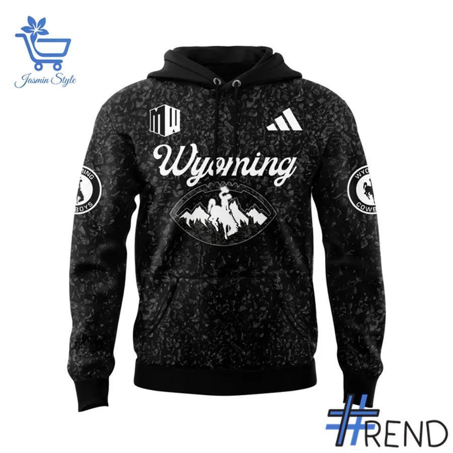 Featuring a distinct coal-black textured pattern, this hoodie stands out with its powerful, battle-ready look. The front displays the elegant “Wyoming” script logo above a striking mountain range and bucking horse emblem, symbolizing the strength and pride of the Cowboys. On the back, a large white silhouette of the iconic bucking bronco adds unmistakable energy and attitude. The sleeves carry Wyoming Cowboys patches, completing the authentic, team-inspired look. Subtle details like the Adidas logo and Mountain West insignia lend a premium, collegiate finish that reflects the hoodie’s championship-level design.